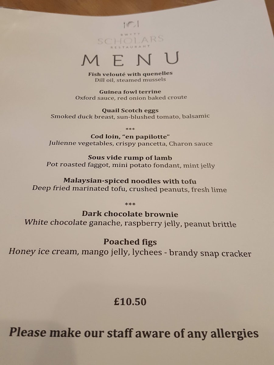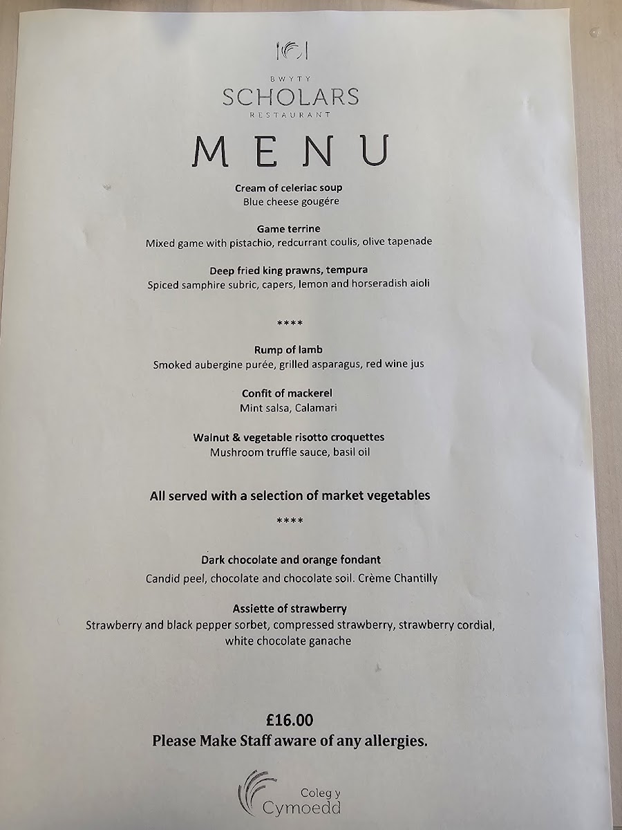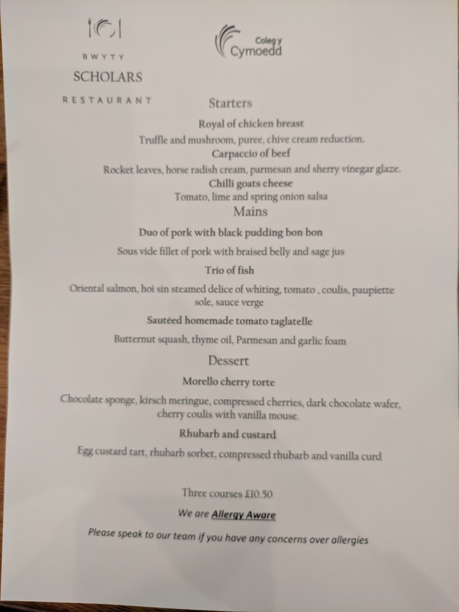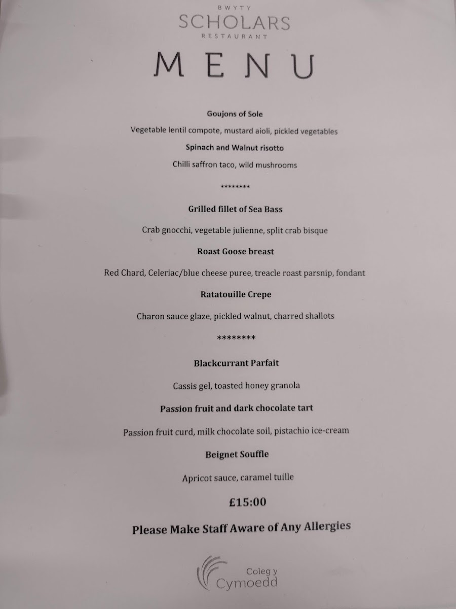 The menu at Scholars Restaurant - Coleg Y Cymoedd offers a variety of creatively crafted dishes, showcasing both modern and traditional flavors. For starters, guests can enjoy options like the Royal of Chicken Breast, Carpaccio of Beef, or the unique Chilli Goats Cheese. For the main course, the restaurant presents hearty choices such as the Duo of Pork with Black Pudding Bon Bon, Trio of Fish, or the flavorful Sautéed Homemade Tomato Taglatelle. Desserts feature sweet indulgences like the Morello Cherry Torte and Rhubarb and Custard, perfect for a satisfying end to the meal. In addition to the main menu, there are other tantalizing selections, including the rich Fish Velouté with Quenelles, the elegant Guinea Fowl Terrine, and the crispy Quail Scotch Eggs. For those looking for a savory delight, the Cod Loin "En Papilotte" and Sous Vide Rump of Lamb provide a satisfying and gourmet experience. Each dish reflects the restaurant's commitment to fine dining, offering a balance of classic and innovative flavors that will leave guests thoroughly impressed.